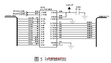通過軟件參與設(shè)置,很容易得到全頻段內(nèi)的預(yù)置誤差數(shù)據(jù)。對(duì)于2-20GHz的微波振蕩器,如果每隔5MHz設(shè)置補(bǔ)償一個(gè)點(diǎn),那么存儲(chǔ)器至少需要3600個(gè)地址空間,在此選擇8k×8靜態(tài)存儲(chǔ)器芯片,存儲(chǔ)空間滿足要求。在時(shí)鐘的同步控制下,地址生成器產(chǎn)生對(duì)應(yīng)地址,該系列數(shù)據(jù)被存入RAM中,電路如圖5所示。