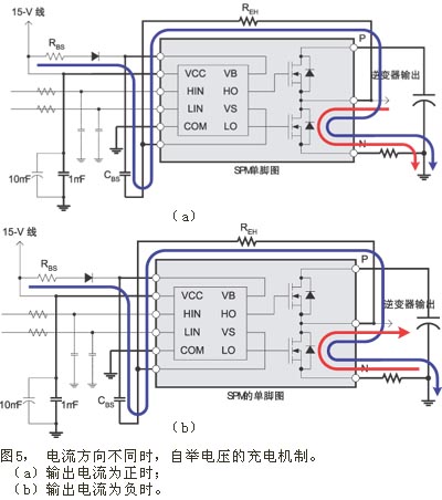 MOSFET逆變器的另一個優(yōu)點是圖4(e)所示的自舉電壓(陰極輸出電壓)。從圖4(e)可以看出,電機的工作頻率為10Hz。圖中畫出了自舉電壓和逆變器輸出電流。當電流為正時,自舉電壓VBS維持在VCC=15V附近,但當電流為負時,VBS就下降到接近10V。這是由于不同電流方向采用不同的充電機制所造成 (參見圖5)。當輸出電流為正時,電流要么流經(jīng)高壓側(cè)MOSFET,要么流經(jīng)低壓側(cè)體二極管。在這種情況下,當?shù)蛪簜?cè)體二極管導(dǎo)通時,將對自舉電容CBS充電 (參見圖5(a))。此時,對CBS的充電電壓可由公式(2)表示。