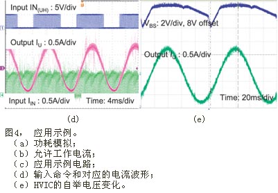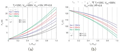 圖4給出了本模塊的一個應(yīng)用示例。在圖4(a)和(b) 的模擬中,假設(shè)結(jié)區(qū)溫度Tj保持為125℃;該溫度為本模塊的最大工作結(jié)區(qū)溫度。通過這項模擬,肯定當模塊外殼溫度控制在100℃并采用空間向量調(diào)制 (SVPWM) 時,輸出功率可大于Pout=100W,并允許Pd=16W的功率損耗。根據(jù)這些信息,我們利用一臺130W BLDC電機(正弦反電動勢) 和圖4(c)所示的電路,對模塊的額定功率進行驗證實驗。實驗中采用的散熱片有效表面積約為100cm2。采用該散熱片后,模塊在20kHz SVPWM下可向電機輸出150W的功率;熱功耗為12W。而此時模塊的外殼溫度為86℃,MOSFET結(jié)區(qū)溫度為104℃,環(huán)境溫度27℃。在同樣條件下采用圖4(d)所示的非連續(xù)PWM時,由于有效開關(guān)頻率降低,模塊的功耗可達到8W,而逆變器效率可達到95%。此時,模塊的外殼溫度為62℃,結(jié)區(qū)溫度為82℃(已考慮電機鐵芯的損耗),逆變器的損耗為整個系統(tǒng)功耗的27%