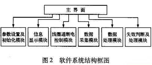 本系統(tǒng)應用軟件由6個功能模塊組成:參數設置及初始化模塊、信息顯示模塊、線圈通斷電控制模塊、數據采集模塊、數據處理模塊、失效判定及處理模塊,其結構框圖如圖2所示。
