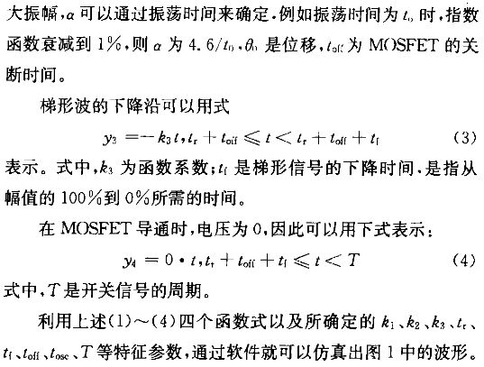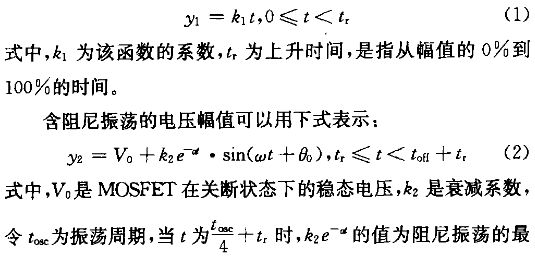 圖1中展示了一MOSFET的漏源極電壓波形,為了研究其上升時間、下降時間、阻尼振蕩等對其頻譜的影響,需要確定該波形的特征參數(shù),然后運(yùn)用Matlab編程仿真。由于該波形是由一個梯形信號和一個阻尼振蕩信號疊加而成,因此可以用分段函數(shù)進(jìn)行模擬。上升沿可以用式(1)表示。