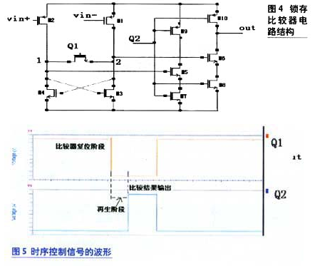 因前置放大器的增益與輸入電壓的乘積不足以達到輸出VOH的要求,所以把放大后的電壓再加到鎖存器上即可以得到所要求的電壓。第三級比較器的結構采用可再生比較器,它也是使用正反饋來實現(xiàn)兩個信號的比較。可再生比較器又稱為鎖存比較器。比較器中兩相非交疊時鐘控制,確定不同的工作模式,從而實現(xiàn)比較器的復位與輸出。其電路的拓撲結構如圖4所示。其中兩相非交疊時鐘Q1和Q2的波形如圖5所示。