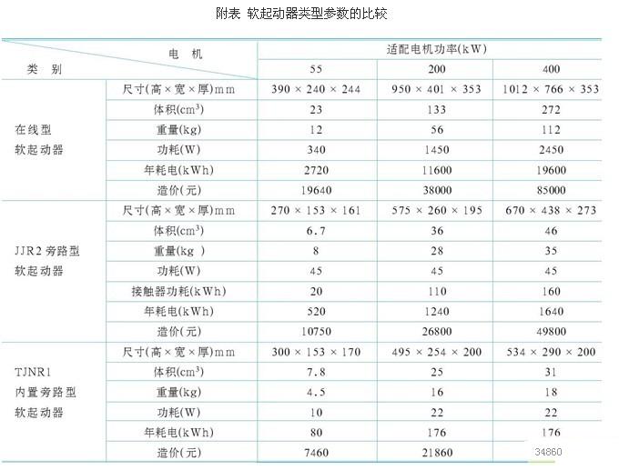 從表中可以看出,旁路型軟起動器優(yōu)于在線型軟起動器,而內置旁路型軟起動器的優(yōu)于旁路型和在線型軟起動器。但價格卻是越先進,成本越低,這是高科技的一般規(guī)律。以附表內舉例品牌來比較,在線型軟起動器是旁路型軟起動器的1.5倍,旁路型軟起動器的是內置旁路型軟起動器的1.4倍(不算接觸器的價格)。而能耗比較,在線型軟起動器是旁路型軟起動器的10倍左右,而旁路型軟起動器的是內置旁路型軟起動器的7倍左右。