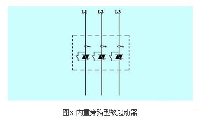 內置旁路型軟起動器(簡稱電動機控制器),顧名思義是在旁路型軟起動器內部加裝一套與晶閘管并聯(lián)的接觸器,在電機軟啟動過程和軟停車過程中由晶閘管運行,機械觸頭斷開,當電動機正常運行時晶閘管關閉,機械觸頭閉合。這套動作過程是通過內部控制器自動完成的,對外部接線來講是一個裝置,所以稱做在線運行。它又可稱作旁路型的軟啟動器將外邊的接觸器移到了軟啟動器里邊集成為一體并能保證體積不增加。它的優(yōu)點是具備上述兩種類型的所有優(yōu)點同時回避了它們各自的缺點:一是電路簡單;二是自然風冷;三是晶閘管只負責啟動和停車,回避了晶閘管在線運行所帶來的功耗與散熱;四是強大的智能控制器的作用得以全面發(fā)揮,能對電動機起到起停、保護及其控制;五是節(jié)省成套空間;六是由于晶閘管和機械觸頭組合一體的設計,通過智能控制器實現(xiàn)了機械觸頭無電弧,使得機械觸頭的電壽命等于機械壽命,解決了接觸器長期以來難以解決的問題,與旁路型軟起動器相比大大提高了接觸器的可靠性,如圖3所示。