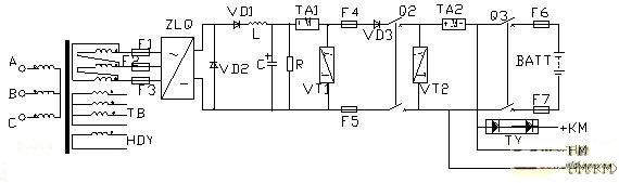 圖中VD3的作用是一個逆阻二極管,防止外部電源倒灌充電機。二極管后邊的開關(guān)就是充電機輸出開關(guān)。從這里出去的直流分為三路:一路去電池,一路去動力合閘母線,另一路為控制母線提供前級電源。