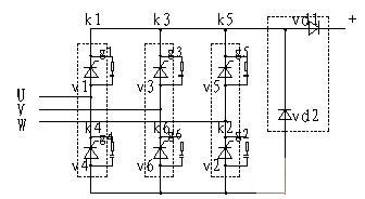 隨著現(xiàn)代集成技術(shù)的發(fā)展,功率大、體積小的可控硅模塊取代了原來的單元可控硅,一般一個橋臂是一個可控硅模塊,三個可控硅模塊組成一個三相全控橋,再加上一個有續(xù)流二極管和隔離二極管組成的二極管模塊,就組成了充電機的整流部分(見圖2),虛線框內(nèi)表示為一個模塊。照下面的接線方式,可控硅的觸發(fā)順序為V1、V2、V3、V4、V5、V6。