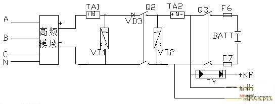 ⑴ 由于高頻模塊具有良好的輸入過欠壓和輸出過欠壓保護,而且具有良好的限流功能,因此,在輸入側(cè)和輸出側(cè)不需另加熔斷器保護。由于高頻模塊本身具有電壓電流顯示功能,而且監(jiān)控器也可以顯示系統(tǒng)中的其他參數(shù),因此,在高頻系統(tǒng)中,相控系統(tǒng)中常用的表記也可以省略。