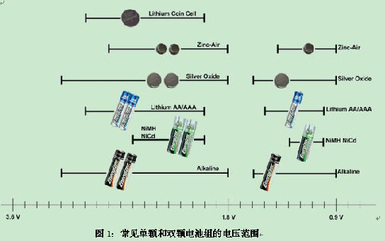 多數(shù)低端和中端便攜式產(chǎn)品都會使用可替換的電池或充電電池,這些電池還能由使用者自行更換。如圖1所示,剛充完電時(shí)的單節(jié)電池電壓通常會在1.2-1.6V之間,電力耗盡時(shí)則下降至0.9-1.0V。把兩個(gè)單節(jié)電池串聯(lián)即可提供1.8-3.2V之間的電壓。