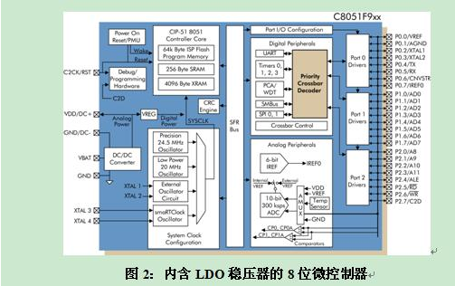 CMOS邏輯門的動態(tài)功耗可寫為:P = C × V2 × f,其中C為負(fù)載電容,它是設(shè)計(jì)和工藝技術(shù)的函數(shù);V為供應(yīng)電壓;f則是開關(guān)頻率,它是應(yīng)用處理需求的函數(shù)。電源電壓是控制功耗的主要手段,因此若能像C8051F9xx內(nèi)含低壓差 (LDO) 穩(wěn)壓器一樣,直接在芯片中增加電壓轉(zhuǎn)換功能,就能提供穩(wěn)定的1.8V電壓給微控制器的數(shù)字核心 (參考圖2),使動態(tài)功耗大幅下降。