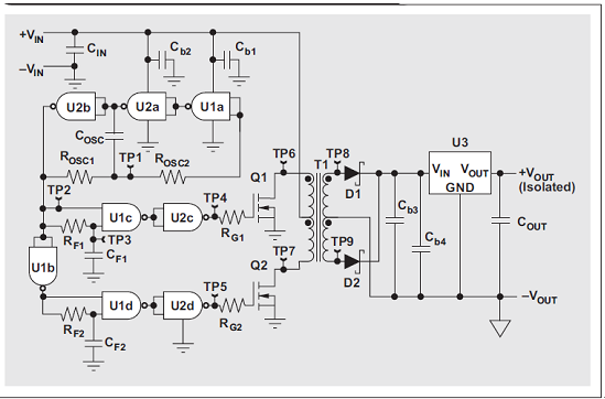 如果應(yīng)用要求 2 kV 以上的隔離電壓、60% 以上的轉(zhuǎn)換器效率或者標(biāo)準(zhǔn)組件可靠的有效性,那么分立設(shè)計(jì)就是一種能夠替代集成組件的低成本方案。分立 DC/DC 轉(zhuǎn)換器設(shè)計(jì)的缺點(diǎn)是需要做大量的工作——選擇穩(wěn)定的振蕩器結(jié)構(gòu)和先斷后通電路,選擇可以通過標(biāo)準(zhǔn)邏輯門有效驅(qū)動(dòng)的MOSFET,適宜實(shí)施溫度和長(zhǎng)期可靠性測(cè)試。所有這些努力都要花費(fèi)時(shí)間和資金。因此,在倉促進(jìn)行這樣一個(gè)計(jì)劃以前,設(shè)計(jì)人員應(yīng)該考慮到下列事項(xiàng):集成組件通常已通過溫度測(cè)試,并且擁有其他工業(yè)資質(zhì)。這些組件不僅僅是最可靠的解決方案,而且還擁有較快的上市時(shí)間。