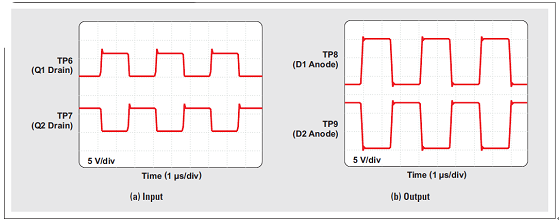 隔離變壓器 (T1) 擁有 2:1 的次級(jí)對(duì)初級(jí)匝數(shù)比、0.9 mH 的初級(jí)線圈電感,以及 3kV 的保證隔離電壓。圖 4 顯示了變壓器的輸入和輸出波形。