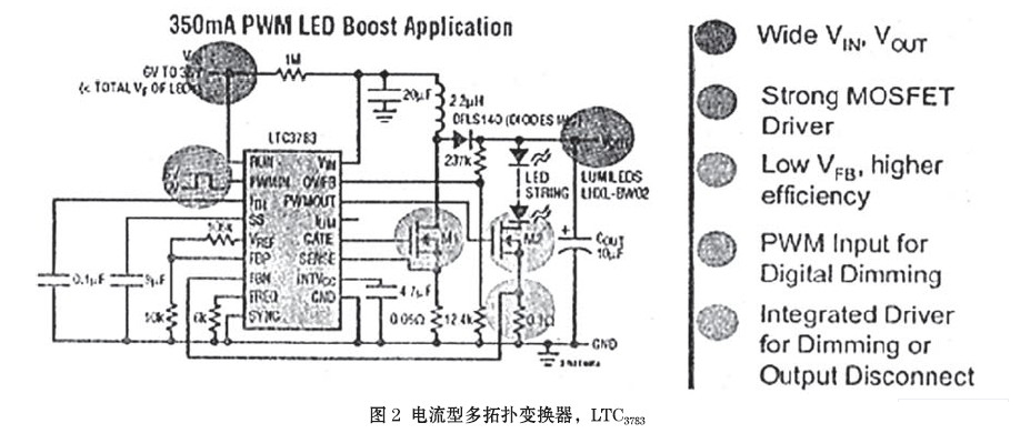 LTC3783是帶恒流PWM調(diào)光的電流型多拓撲變換器(圖2),用于驅(qū)動大功率LED燈串。本項專利技術(shù)可提供非??於鴾蚀_的負載切換,不會產(chǎn)生瞬時的欠電壓或過電壓,能數(shù)字式達到3000∶1的調(diào)光率(100Hz),純色的PWM調(diào)光可確保白色LED和紅綠藍(RGB) LED的顏色完整性。LTC3783利用模擬控制,容許附加100∶1的調(diào)光比,因人眼對周圍光線的變化很敏感,故這一比率必不可少。該多功能的控制器可用于升壓、降壓、升降壓雙向變換器或反激式(Flyback)變換器,或作為恒流/恒壓的調(diào)節(jié)器。利用MOSFET的通態(tài)電阻(on-resistance)可取消傳感電流的電阻器,并提高了效率。LTC3783芯片的應(yīng)用還包括:高電壓LED陣列和LED背光,以及在電訊、自動化與工業(yè)控制系統(tǒng)中的調(diào)節(jié)器。