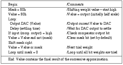 在逐次逼近ADC中,內(nèi)部DAC的位模擬系列二進(jìn)制重量,比較器輸出模擬天平指示。驅(qū)動權(quán)位處理的邏輯保存在封裝好的ADC的逐次逼近寄存器(SAR)或者控制DAC/比較器電路的處理器軟件子程序,該子程序可由不到20行的代碼來實(shí)現(xiàn)。