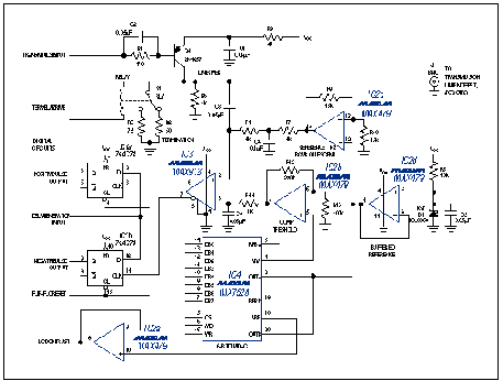 圖8中比較器(IC3)采用單電源供電、地電位檢測以及僅10ns傳輸延遲。DAC (IC4)為雙通道器件,一方面用于脈沖高度測量,另一方面驅(qū)動LCD對比度控制(如圖3)。注意DAC為反向驅(qū)動;電流輸出端連接在一起由經(jīng)過緩沖的電壓基準(zhǔn)驅(qū)動,基準(zhǔn)輸入作為電壓輸出(每路帶有一個外部放大器緩沖)?! ?br />