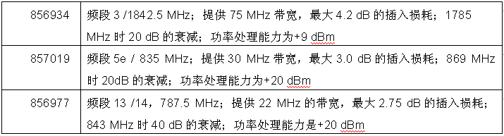 TriQuint公司的新型射頻聲表面波濾波器的技術(shù)細(xì)節(jié)速覽表