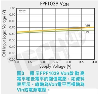 資料表中的規(guī)格增加了針對(duì)製程、電壓和溫度變化的緩衝,表明Von必須超過1.0V來開啟開關(guān),并且必須低于0.4V來關(guān)閉開關(guān)。這帶來了非常簡(jiǎn)單的驅(qū)動(dòng)電路,可以直接連接至微處理器。此Von規(guī)格隨元件而不同且可能不一定會(huì)如圖3那樣平坦。不要停留在資料表中顯示靜態(tài)閾值電平的那一行;可以參照曲線來瞭解全部詳情。