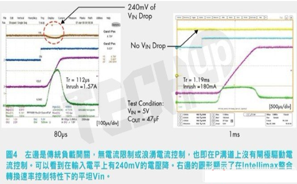 我們應(yīng)該更進(jìn)一步鉆研的下一代智慧型FET的特性是當(dāng)開關(guān)關(guān)閉時(shí)會(huì)發(fā)生什么?採(cǎi)用離散P溝道的傳統(tǒng)負(fù)載開關(guān)可以完全關(guān)閉并連接輸入至輸出,不管是重負(fù)載還是大電容載入在輸出腳上。如果這種情況發(fā)生,通常初級(jí)端輸入電平會(huì)顯示電壓突降,它可能影響與偏置電平相關(guān)聯(lián)的精密類比數(shù)位轉(zhuǎn)換器(ADC)或感測(cè)器。在過去,電阻/電容(R/C)網(wǎng)路添加至閘極以降低開啟速度,但這會(huì)增加專案的設(shè)計(jì)時(shí)間和規(guī)模。Intellimax支援轉(zhuǎn)換速率控制特性,藉著在輸入端限制浪涌電流,可使電平中斷最小化。圖4顯示了此方案在實(shí)證研究的實(shí)驗(yàn)室測(cè)試中的一個(gè)例證。注意,左邊為採(cǎi)用傳統(tǒng)P溝道方法對(duì)Vin電平的影響,右邊的則是Intellimax器件的影響。