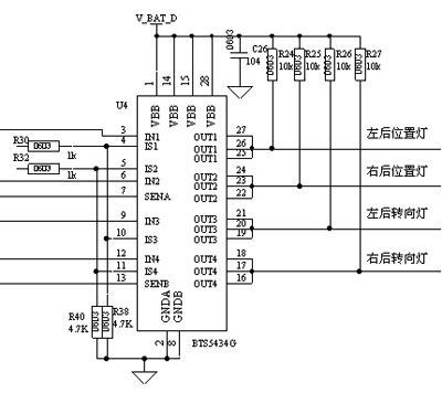 智能車燈控制系統(tǒng)由轎車中12V低壓大電流系統(tǒng)供電,通過(guò)MCU控制Infineon智能功率開關(guān)實(shí)現(xiàn)上述所有功能。在這套為以ROVER平臺(tái)開發(fā)的燈控系統(tǒng)中使用了Infineon新一代的芯片:BTS6142D和BTS5434G等。