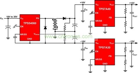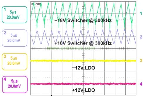 要創(chuàng)建這種參考設(shè)計,需使用一個降-升壓結(jié)構(gòu)的 +60V 開關(guān)轉(zhuǎn)換器來產(chǎn)生一個平衡的+/-輸出電壓。利用低噪聲、高 PSRR LDO(例如:TPS7A30 和 TPS7A49 等),對開關(guān)的正負電壓輸出進行后期穩(wěn)壓。圖 2 中,–18V 軌的開關(guān)穩(wěn)壓器電壓紋波為約 40mV,而 +18V 軌則為 20mV。通過使用 LDO 對 300 kHz 開關(guān)穩(wěn)壓器的輸出進行后期穩(wěn)壓,電壓紋波得到極大減弱。這里,我們使用 60V 開關(guān)轉(zhuǎn)換器,因為接地引腳參考至 –18V 軌,并且最大 VIN為 30V。在這種配置中,開關(guān)轉(zhuǎn)換器必須承受的最大電壓為 48V。請為其寬輸入電壓、低輸出噪聲和高 PSRR 選擇 LDO。