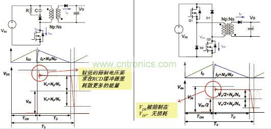 單開關(guān)對比雙管QR反激轉(zhuǎn)換器如圖3所示,左邊為單開關(guān)QR反激,右邊為雙開關(guān)QR反激。