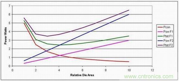 但是,在更高的工作頻率下,最佳裸片面積較小,從而帶來成本節(jié)約。實際上,在低頻率下,通過調(diào)整裸片面積來最小化損耗會帶來極高成本的設(shè)計。但是,轉(zhuǎn)到更高工作頻率后,我們就可以優(yōu)化裸片面積來降低損耗,從而縮小電源的半導(dǎo)體體積。這樣做的缺點是,如果我們不改進半導(dǎo)體技術(shù),那么電源效率將會降低。