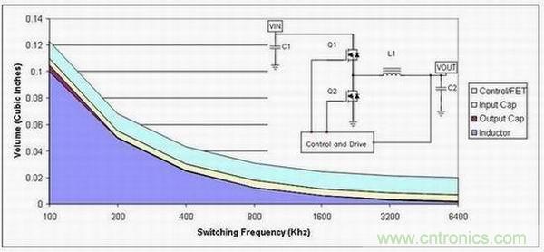 圖1顯示的是降壓電源頻率與體積的關(guān)系。頻率為100 kHz時,電感占據(jù)了電源體積的大部分(深藍(lán)色區(qū)域)。如果我們假設(shè)電感體積與其能量相關(guān),那么其體積縮小將與頻率成正比例關(guān)系。由于某種頻率下電感的磁芯損耗會極大增高并限制尺寸的進一步縮小,因此在此情況下上述假設(shè)就不容樂觀了。如果該設(shè)計使用陶瓷電容,那么輸出電容體積(褐色區(qū)域)便會隨頻率縮小,即所需電容降低。另一方面,之所以通常會選用輸入電容,是因為其具有紋波電流額定值。該額定值不會隨頻率而明顯變化,因此其體積(黃色區(qū)域)往往可以保持恒定。另外,電源的半導(dǎo)體部分不會隨頻率而變化。這樣,由于低頻開關(guān),無源器件會占據(jù)電源體積的大部分。當(dāng)我們轉(zhuǎn)到高工作頻率時,半導(dǎo)體(即半導(dǎo)體體積,淡藍(lán)色區(qū)域)開始占據(jù)較大的空間比例。