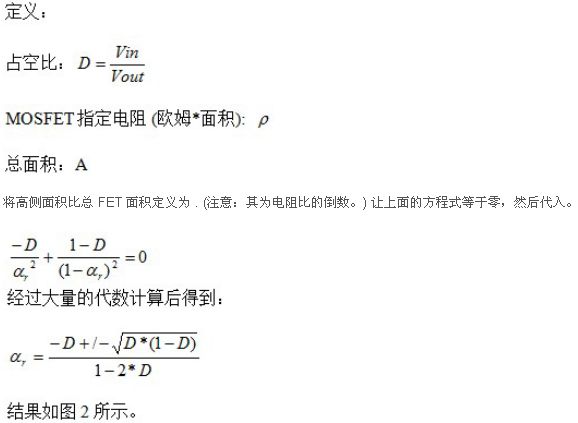 通過圖1,我們知道50%轉(zhuǎn)換比率時出現(xiàn)最佳傳導損耗極值。但是,在其他轉(zhuǎn)換比率條件下,可以將損耗降至這一水平以下。附錄給出了進行這種優(yōu)化的數(shù)學計算方法,而圖2顯示了其計算結(jié)果。即使在極低的轉(zhuǎn)換比率條件下,F(xiàn)ET芯片面積的很大一部分都應該用于高側(cè)FET。高轉(zhuǎn)換比率時同樣如此;應該有很大一部分面積用于低側(cè)。這些結(jié)果是對這一問題的初步研究,其并未包括如高側(cè)和低側(cè)FET之間的各種具體電阻值,開關(guān)速度的影響,或者對這種芯片面積進行封裝相關(guān)的成本和電阻等諸多方面。但是,它為確定FET之間的電阻比提供了一個良好的開端,并且應會在FET選擇方面實現(xiàn)更好的整體折中。