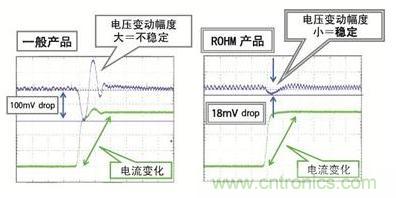 參見表1?;旧?,兩種產(chǎn)品都是高效同步整流的降壓型控制器,不僅在重負載時的效率高,輕負載時的效率也很高。標準電壓為0.75V/0.7V,適用低電壓,±1%的精度對于前述的±3%的精度來說具有充分的余量。不僅如此,通過ROHM獨創(chuàng)的H3RegTM控制模式實現(xiàn)了高速負載瞬態(tài)響應(圖4),非常適合用作FPGA電源。