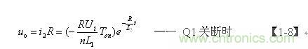 【1-8】式中,L1、L2分別為開關(guān)變壓器初、次級線圈的電感,n為開關(guān)變壓器線圈的匝數(shù)比,n=N2/N1,Ui為變壓器初級線圈的輸入電壓,Ton為開關(guān)管的導(dǎo)通時間,R為等效負載電阻。