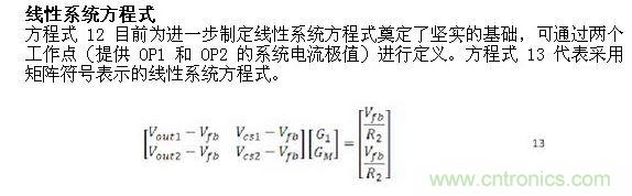 Vcs1 和 Vcs2 可通過方程式 4 確定。請(qǐng)選擇 R2 的值。最佳實(shí)踐是選擇已經(jīng)存在于電源設(shè)計(jì)中的值,因?yàn)檫@有助于確保網(wǎng)絡(luò)穩(wěn)定性。轉(zhuǎn)換器的反饋電壓 Vfb 可在穩(wěn)壓器產(chǎn)品說明書中找到。這樣我們可手動(dòng)或用數(shù)學(xué)工具解算線性系統(tǒng)方程式,結(jié)果就是 G1 和 GM 電導(dǎo)值。反過來(lái),其結(jié)果就是 R1 和 RM。