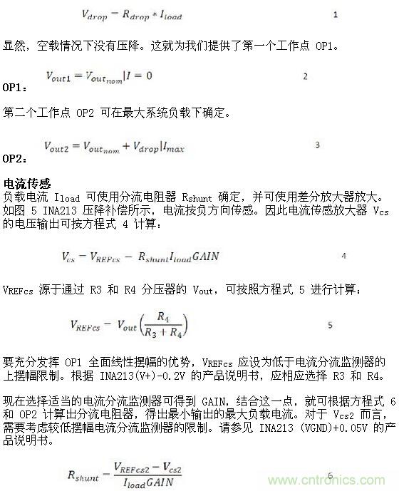 如圖 5 所示,用電流分流監(jiān)測(cè)器 INA213 測(cè)量電流可實(shí)施壓降補(bǔ)償。電壓輸出 Vcs 通過 Rm 反饋至轉(zhuǎn)換器的反饋電阻器網(wǎng)絡(luò)。轉(zhuǎn)換器塊 P1 說明了控制環(huán)路非常基本的原理。反饋 FB 好比參考電壓,而 Vout 通過致動(dòng)器方案調(diào)節(jié),這里 FB 就是 VREF。因此,反饋電壓 FB 可視為恒定,而且等于轉(zhuǎn)換器的 VREF,其可用作所有計(jì)算的基礎(chǔ)。通過分流電阻器 Rs 的負(fù)載電流 Iload 的反向測(cè)量是應(yīng)用的關(guān)鍵。如果在負(fù)載電流 Iload 上升時(shí)要讓 Vout 上升,那么電流分流監(jiān)測(cè)器的輸出電壓 Vcs 就需要降低。在空載條件下 Vcs 是 VREF。如果負(fù)載提升,Vcs 會(huì)下降,而 Vout 則會(huì)相應(yīng)上升。這正是我們想要的結(jié)果。