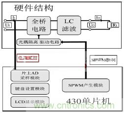 考慮到系統(tǒng)效率,不需要進(jìn)行boost升壓,可以直接逆變。故本系統(tǒng)結(jié)構(gòu)圖如圖1所示。SPWM信號控制硬件全橋電路,然后經(jīng)過LC濾波電路可以得到正弦波。以MSP430單片機為核心的數(shù)字控制系統(tǒng)需要采樣電流量、控制硬件電路系統(tǒng)以及形成良好的人際交互界面。