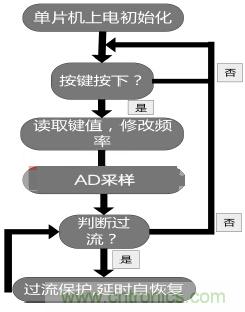 軟件結(jié)構(gòu)框圖如圖1,主程序框圖如圖3。程序執(zhí)行的流程如下所述:單片機上電之后,系統(tǒng)進(jìn)行按鍵、片上ADC12和LCD顯示屏初始化,程序查詢按鍵,若有相應(yīng)按鍵按下,修改正弦波頻率,然后AD采樣電流判斷是否過流;否則返回繼續(xù)查詢按鍵。如果輸出過流,程序?qū)㈥P(guān)閉SPWM輸出,延時自恢復(fù);否則返回按鍵查詢。
