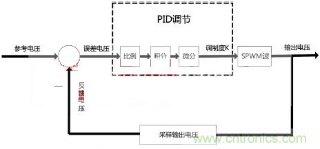 由于輸入電壓隨著負(fù)載變大會有降低,切系統(tǒng)濾波電感具有電阻成分,這些因素導(dǎo)致在系統(tǒng)開環(huán)下負(fù)載調(diào)整率較大,因此本系統(tǒng)采用閉環(huán)反饋調(diào)整輸出電壓穩(wěn)定在10V。我們選用經(jīng)典PID反饋調(diào)整,對輸出電壓進(jìn)行采樣,與參考電壓比較得到誤差電壓后進(jìn)行位移式PID調(diào)節(jié),PID運算輸出作為SPWM的調(diào)制度K,與正弦波表相乘后形成新的波表進(jìn)行生成SPWM波運算。用此方法后負(fù)載調(diào)整率降到了1%以下,圖5是反饋過程框圖。