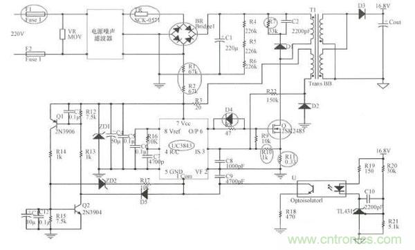 由于大部分電源故障發(fā)生在16.8 V前級(jí)輸出,故下文選取AC/DC模塊進(jìn)行分析,圖3為結(jié)合實(shí)物電路板逆向繪出的電路原理圖。結(jié)合本文上面內(nèi)容介紹,可以得出結(jié)論:本模塊采用了以UC3843芯片為核心的隔離型反激開(kāi)關(guān)電源結(jié)構(gòu)。