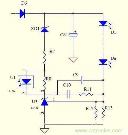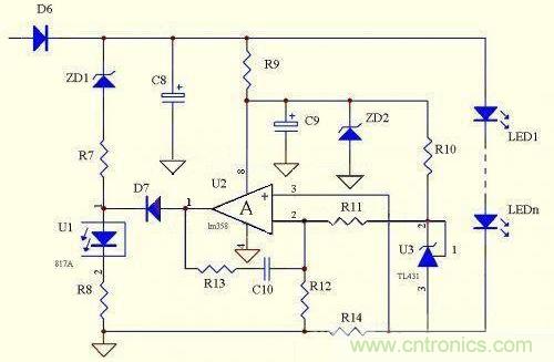 優(yōu)點(diǎn):電路簡單,元器件少,成本低,跟上面電路相比,顯著降低了取樣電阻的功耗,恒流精度很高,克服了上面的電路不能空載的致命缺陷,當(dāng)有個別LED擊穿時,可以自動調(diào)整輸出電壓。