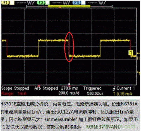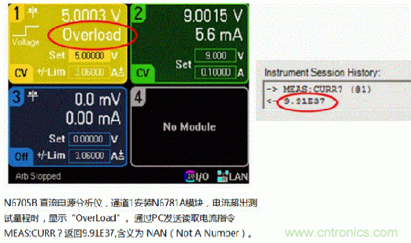 設定N6781A源表模塊的電流量程1mA,然后控制輸出電流超過1mA。此時,顯示屏上直接顯示“OverLoad”,而不是電流的數值。如果通過PC發(fā)送讀取電流指令,你會讀到9.91E37,這個數值9.91E37在SCPI(儀表編程命令標準)中被定義為“NAN”(Not A Number)。所有是德科技的測試儀表都是遵循SCPI標準的,當實際值超出量程時,電源返回9.91E37。NAN(9.91E37)實際代表一個32bit浮點數,在所有測量儀表中預計都不會出現這么大的數值。