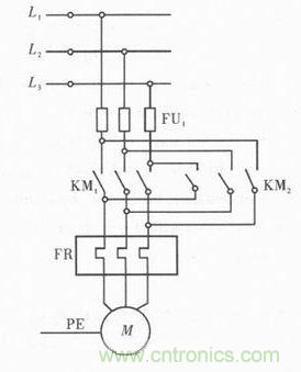在眾多的操作系統(tǒng)中均要求電動(dòng)機(jī)能夠?qū)崿F(xiàn)正反轉(zhuǎn)給操作,從電動(dòng)機(jī)的工做原理中可知,需將三相電源中的任意兩個(gè)進(jìn)行對(duì)調(diào),就能實(shí)現(xiàn)電動(dòng)機(jī)的反向運(yùn)轉(zhuǎn),因此電動(dòng)機(jī)實(shí)現(xiàn)正反轉(zhuǎn)的實(shí)質(zhì)便是電源進(jìn)線(xiàn)的調(diào)換。但若僅調(diào)換進(jìn)線(xiàn),容易導(dǎo)致電源短路,因此必須設(shè)置互鎖,圖2是三相異步電動(dòng)機(jī)正反轉(zhuǎn)的原理設(shè)計(jì)圖,圖中KM1和KM2均是交流接觸器主觸頭,當(dāng)KM1吸合時(shí),KM2交流接觸器主觸頭就會(huì)斷開(kāi),然后便可實(shí)現(xiàn)電機(jī)的正轉(zhuǎn)。若是斷開(kāi)交流接觸器主觸頭KM1,KM2就會(huì)吸合,此時(shí)電動(dòng)機(jī)則會(huì)實(shí)現(xiàn)反轉(zhuǎn),圖中的FU1主要用于防止電源短路,圓形代表電機(jī)M。