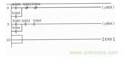 在圖3梯形圖中,PLC外部按鈕所控制的常開(kāi)觸點(diǎn)主要是左母線(xiàn)的第一等級(jí)以及第二等級(jí)的X001觸點(diǎn)和X002觸點(diǎn),只需按鈕便可使得X000或X001任意一個(gè)常開(kāi)觸點(diǎn)閉合,輸出繼電器Y005或繼電器Y004就能通過(guò)相應(yīng)線(xiàn)路形成閉合回路,進(jìn)而使常開(kāi)接觸點(diǎn)Y005或Y004實(shí)現(xiàn)自鎖功能同時(shí)實(shí)現(xiàn)電動(dòng)機(jī)的正反轉(zhuǎn)。停止通過(guò)PLC外部的按鈕實(shí)現(xiàn),按鈕通過(guò)釋放X002常開(kāi)接觸點(diǎn),使得繼電器斷電引發(fā)電動(dòng)機(jī)停止運(yùn)轉(zhuǎn)。
