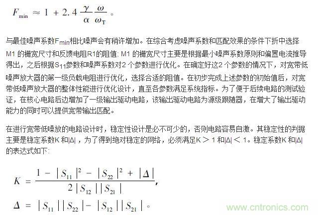 【導(dǎo)讀】本文給出了一種1 ~ 3 GHz 頻段的寬帶低噪聲放大器的設(shè)計(jì),電路采用電阻負(fù)反饋結(jié)構(gòu),采用SMIC 0.18 μm RF CMOS 工藝對寬帶低噪聲放大器進(jìn)行了優(yōu)化分析和仿真,結(jié)果表明在寬帶匹配、通道增益及噪聲系數(shù)方面都取得了較好的性能,對于寬帶低噪聲放大器的設(shè)計(jì)具有一定的參考價值。