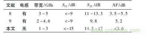本文設(shè)計(jì)的寬帶低噪聲放大器與已經(jīng)發(fā)表文獻(xiàn)中的寬帶低噪聲放大器的性能比較如表1 所示,這些文獻(xiàn)均采用0. 18 μm 工藝進(jìn)行設(shè)計(jì),具有一定的比較意義。通過表1 可以看出,本設(shè)計(jì)中各項(xiàng)參數(shù)都達(dá)到了較好的性能指標(biāo),避免了傳統(tǒng)集成電路設(shè)計(jì)中需要采用電感的缺點(diǎn),而電感通常在電路設(shè)計(jì)中占用非常大的面積,本文設(shè)計(jì)的寬帶低噪聲放大器省略了傳統(tǒng)低噪聲放大器設(shè)計(jì)中的電感,這將在很大程度上減少芯片的面積; 更為重要的是該芯片依靠自身的MOS 管和比例電阻實(shí)現(xiàn)了內(nèi)匹配,避免了大批量應(yīng)用時由于芯片內(nèi)部參數(shù)受工藝參數(shù)影響而造成的外圍匹配電路的更改,簡化了芯片的應(yīng)用,在實(shí)際的工程應(yīng)用中具有重要的意義。