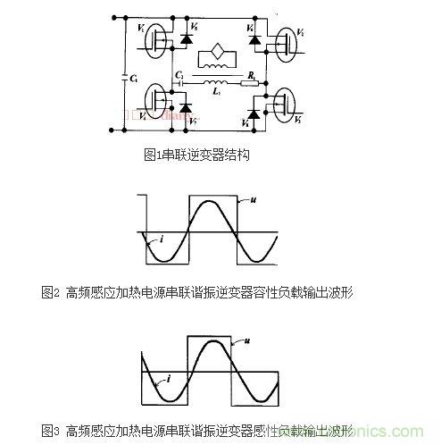作為高頻感應(yīng)加熱電源設(shè)備的重要組成部分,串聯(lián)諧振逆變器在工作中具有損耗低、工作適應(yīng)性良好等優(yōu)勢(shì)。這種逆變器在實(shí)際應(yīng)用中也被稱為電壓型逆變器,其基礎(chǔ)結(jié)構(gòu)的原理圖如圖1所示。在實(shí)際工作的過(guò)程中,串聯(lián)諧振型逆變器的輸出電壓為近似方波。由于電路工作在諧振頻率附近,使振蕩電路對(duì)于基波具有最小阻抗,所以負(fù)載電流ia近似正弦波。同時(shí),為避免逆變器上、下橋臂間的直通,換流必須遵循先關(guān)斷后導(dǎo)通的原則,在關(guān)斷與導(dǎo)通間必須留有足夠的死區(qū)時(shí)間。下圖中的圖2和圖3分別示出容性負(fù)載和感性負(fù)載的輸出波形。