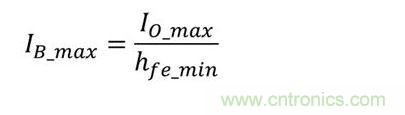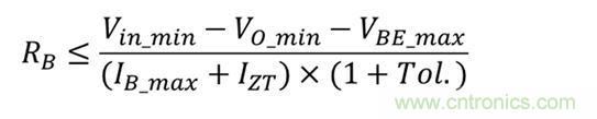 電阻器RB可為齊納二極管和晶體管基極提供電流。在運行條件下,它應(yīng)提供足夠的電流。齊納二極管反向電流IZ應(yīng)大于1mA,正如筆者在“齊納二極管Dz的選擇”部分所討論的。方程式2可估算出運行所需的最大基極電流:
