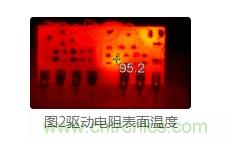 有時,電路參數(shù)和性能看似正常,但實際上隱藏很大的問題。如圖 2所示,某電路基本性能沒有問題,但在常溫下,用紅外熱成像儀一測,不得了了,MOS管的驅(qū)動電阻表面溫度居然達到95.2℃。長期工作或高溫環(huán)境下,極易出現(xiàn)電阻燒壞、模塊損壞的問題??梢?,研發(fā)過程中使用熱成像儀測試元器件的溫度尤其重要,可及時發(fā)現(xiàn)并定位問題點。通過調(diào)整電路參數(shù),降低電阻的歐姆熱損耗,且將電阻封裝由0603改成0805,大大降低了表面溫度。