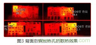 b) MOS管與背面的銅平面的溫差大大減小,熱孔的傳熱性能良好。