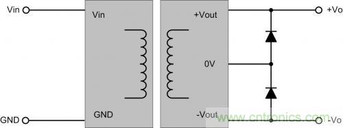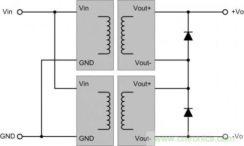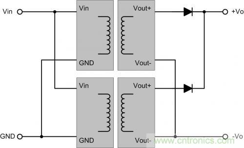 如一個(gè)5V轉(zhuǎn)±12V的電源,若臨時(shí)需要5V轉(zhuǎn)24V,可把負(fù)當(dāng)?shù)?,正輸出?dāng)24V電源,輸出24VDC。應(yīng)用時(shí),在輸出各方向并聯(lián)一個(gè)二極管續(xù)流,防止兩路啟動(dòng)時(shí)間不同,由一路通過負(fù)載給另一路的內(nèi)部電路充電。