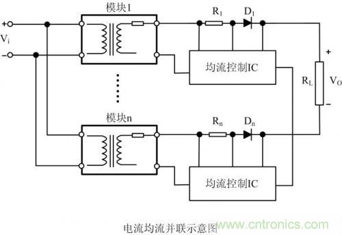 如果兩個模塊的參數(shù)完全相同時,即:VO1(max)= VO2(max)、R1=R2,則兩條負載特性曲線重合,能實現(xiàn)負載電流均勻分配。但在實際應用中,兩個具有相同容量的模塊,VO1(max)與VO2(max)、R1與R2的參數(shù)也不可能完全做到相同。從圖 2可以看出,由于輸出到負載RL的等效阻抗R1、R2很小,輸出電壓即便出現(xiàn)很小的差別也會引起輸出電流很大的變化。例如:當負載RL電流由IO= IO1+ IO2增大到IO、=IO1、+IO2、時,負載特性曲線斜率小的模塊1將承受大部分負載電流,模塊1將運行在滿載或過載限流狀態(tài),影響模塊的可靠性。