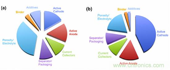 現(xiàn)在鋰離子電池各組分的(a)體積占比和(b)質量占比
