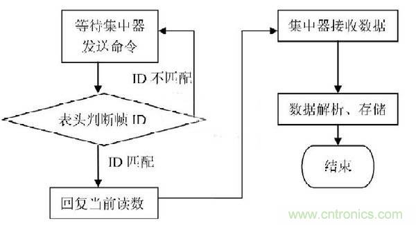 對時成功后,集中器繼續(xù)等待上位機的讀數(shù)命令或等待中斷讀數(shù)命令。當(dāng)收到讀數(shù)的命令后,定時讀數(shù)使集中器按設(shè)置的時間,自動讀取表頭采集來的數(shù)據(jù);讀數(shù)使集中器讀取當(dāng)前表頭的數(shù)據(jù)。