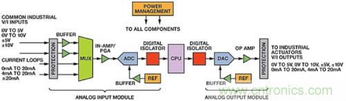 典型模擬I/O模塊包括2個(gè)、4個(gè)、8個(gè)或16個(gè)通道。為滿足嚴(yán)格行業(yè)標(biāo)準(zhǔn),這些模塊需要提供過(guò)壓、過(guò)流和EMI浪涌保護(hù)。大多數(shù)PLC包括ADC和CPU之間、CPU和DAC之間的數(shù)字隔離。高端PLC可能還有國(guó)際電工委員會(huì)(IEC)標(biāo)準(zhǔn)規(guī)定的通道間隔離。 很多I/O模塊包括每通道軟件可編程單端或差分輸入范圍、帶寬和吞吐率。